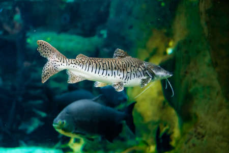 Pseudoplatystoma tigrinum fish, the tiger sorubim long whiskered catfish. Beautiful exotic predator fish against blurred background. Tiger sorubim swims in aquarium
