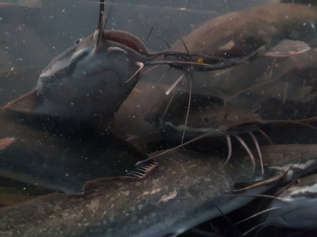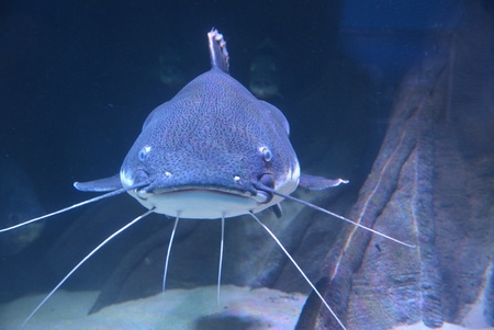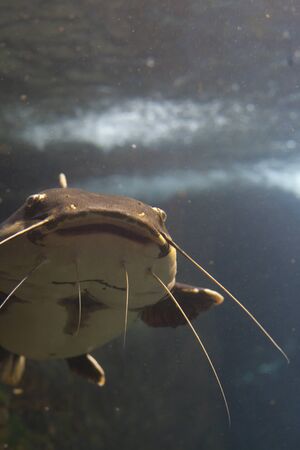 huge catfish head, sea inhabitants in the aquarium, view through the glass. The underwater world in miniature. Horizontal orientation