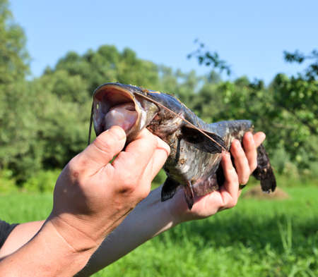 Wild catfish on the blue background. Fish concept with copy space ideal for restaurants. Levitate catfish with long mustache.