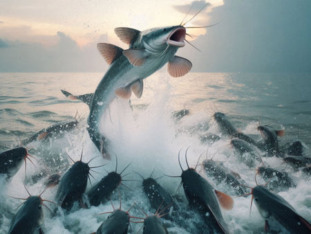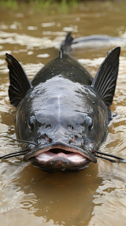A large catfish is surfacing in shallow water, disrupting the serene environment. Its fins are spread, ready for movement as the early morning light reflects off the water's surface.