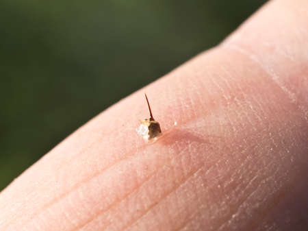 Micro insect larva on human hand, macro photo