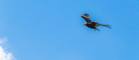 Tropical Black Turkey Vulture Cathartes aura flies lonely with blue cloudy sky background in Playa del Carmen Quintana Roo Mexico.