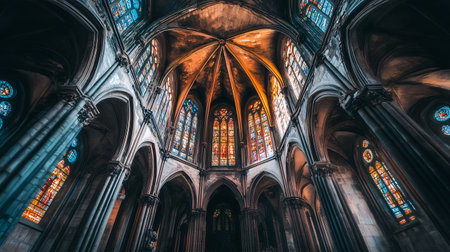 Majestic cathedral interior with high ceilings and intricately stained glass windows. Historical and religious architecture