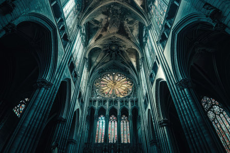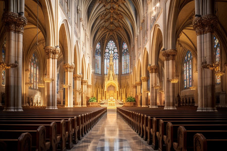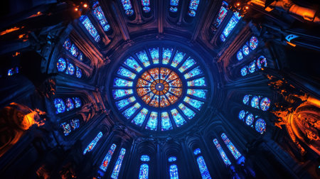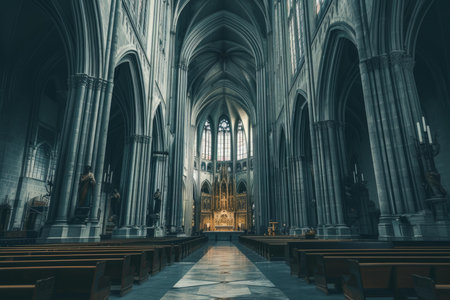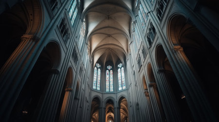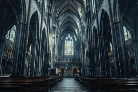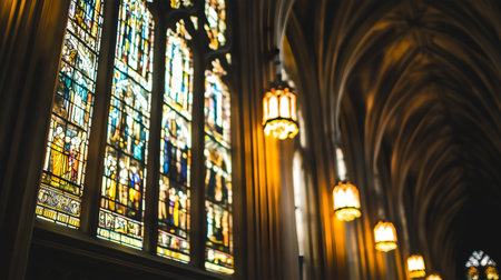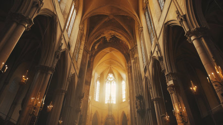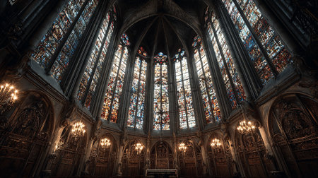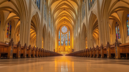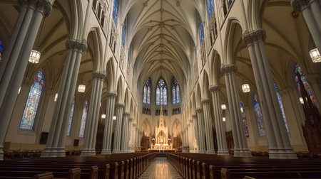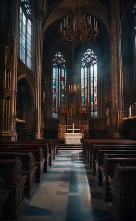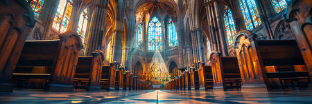 Majestic cathedral interior with high ceilings and intricately stained glass windows. Historical and religious architecture