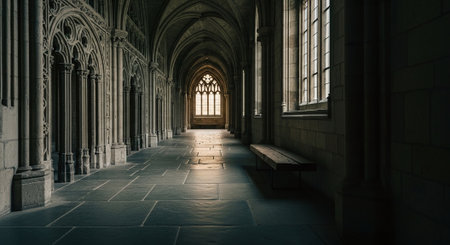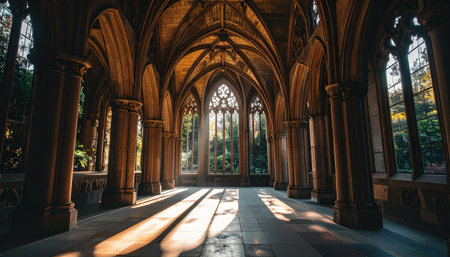 Sunlight streams through ornate gothic windows, casting long shadows across the stone floor of an ancient, empty cloister. The vaulted wooden ceiling and repeating arches create a sense of profound history and quiet contemplation, inviting the viewer on a journey through time.