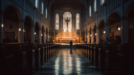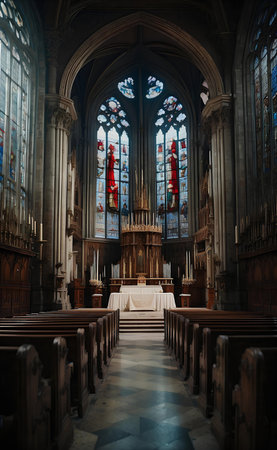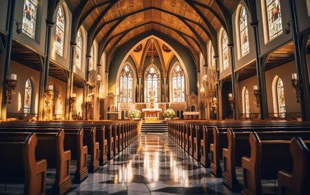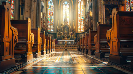 Majestic Church Interior with Stunning Stained Glass Windows and Intricate Wooden Pews. Concept of Sacred Architecture, Spiritual Atmosphere, Historical Heritage, and Religious Artistry.