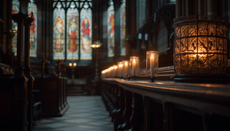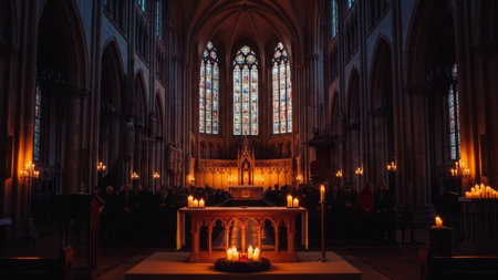 Warm candlelight illuminates the golden altar and stained glass windows of a church, creating a spiritual atmosphere. Ai generative