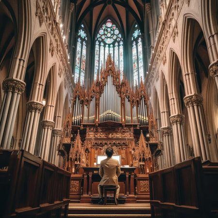 A choir performing in a grand cathedral, with stunning stained glass windows in the background, highlighting the beauty and acoustics of the space.