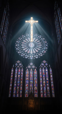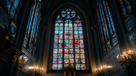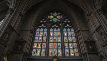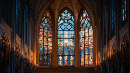 This breathtaking stained glass window showcases intricate biblical scenes, illuminating the elegant interior of a gothic church with vibrant colors and artistic detail.