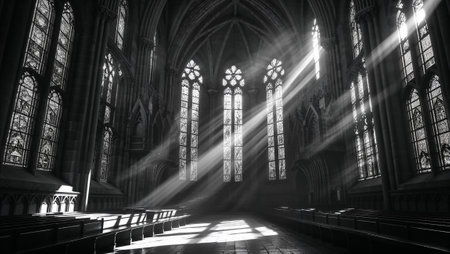 Golden morning light pours through the magnificent arched windows of a historic Gothic cathedral, casting long, dramatic shadows across the stone floor. The empty hall is filled with a sense of peace, reverence, and timeless grandeur, inviting contemplation and awe.