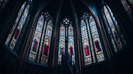 Elaborate stained glass windows adorn the interior of a historic church, filling the space with colorful light. Designed with intricate details, the windows depict scenes that inspire reflection.