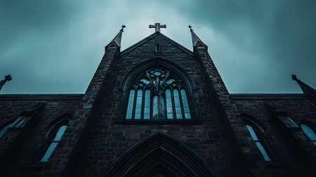 The towering gothic church features intricate architectural details and a beautiful stained glass window, set beneath dark, overcast skies, evoking a sense of reverence and mystery.