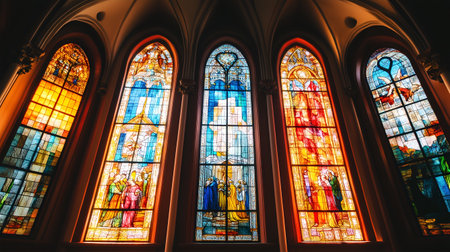 The vibrant stained glass windows of the church depict intricate biblical scenes, glowing brightly as sunlight streams through, creating a mesmerizing atmosphere within the sacred space.