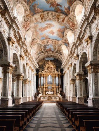 Experience the breathtaking beauty of an ancient church interior, featuring intricate artwork, a grand chandelier, and an atmosphere of spirituality and devotion.