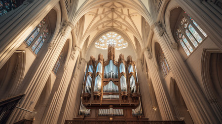 A towering Gothic cathedral showing off its remarkable height and showcasing a breathtaking stained glass window, The intricate inside of a Gothic cathedral, AI Generated