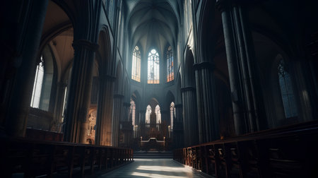 Sunbeams are illuminating a gothic church interior through stained glass windows. Ai generated image