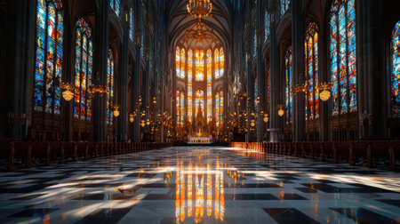 Shiny floor reflecting warm light illuminating columns and stained glass window inside majestic cathedral