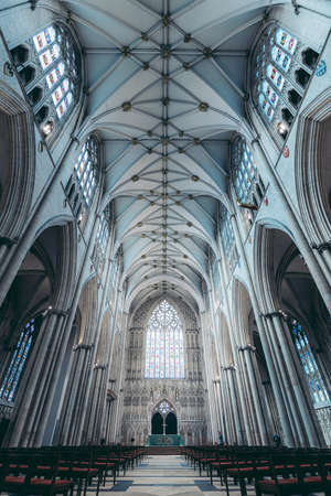 York, North Yorkshire | UK - 2020.09.11: Beautiful empty interior of the York Minster Iconic Gothic style medieval cathedral