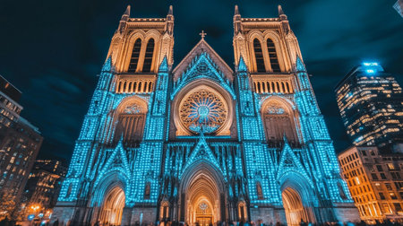 Illuminated Neo-Gothic Cathedral Facade, Majestic Architecture, Night Cityscape Landmark