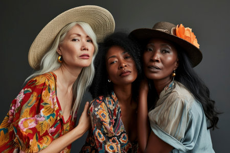 Diverse group of women showcasing beauty and strength, with varying hairstyles and colors, demonstrating confidence, unity, and empowerment in contemporary fashion