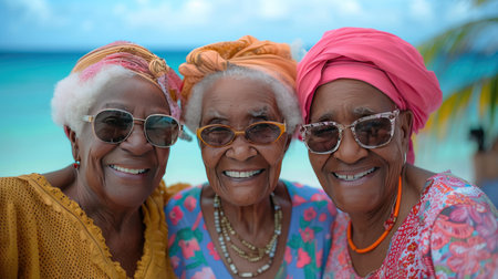authentic portrait of senior women resting on beach, facial expression with bold positive emotions, elderly female friends laughs and hugs, intense expression, grained photo in 90s style, AI generated
