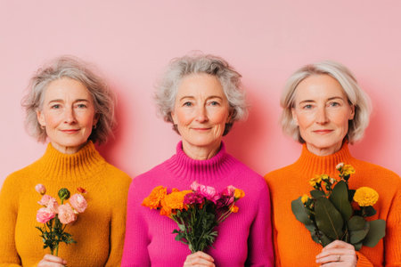 Beautiful elderly women with gray hair wearing colorful sweaters and holding flowers, showcasing joy and warmth against a pink background