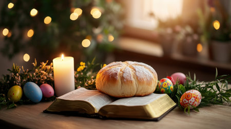Orthodox easter morning with freshly baked bread, candle, and decorated eggs.