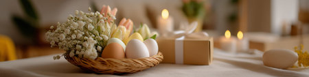 Wicker basket holding decorated Easter eggs and spring flowers on a festive holiday table. Easter background. Easter celebration table setting with decorated eggs