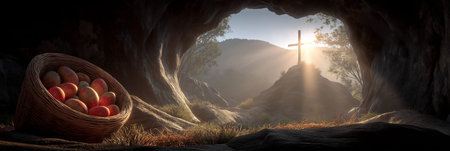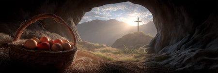 Woven basket with Easter eggs inside a cave looking out at a cross and rising sun. Easter wallpaper. Easter eggs in front of empty tomb seeing cross
