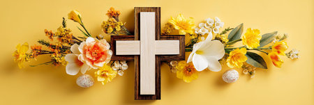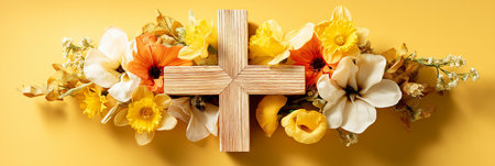 Christian cross decorated with colorful flowers on a yellow background. Traditional Christian cross celebrating Easter with flowers