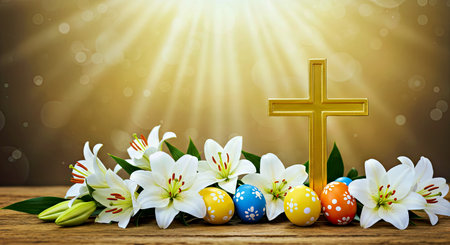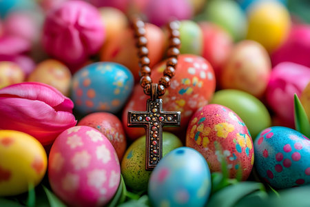 A close-up shot of a cross necklace nestled among vibrant Easter eggs and tulips. A symbol of faith and celebration.