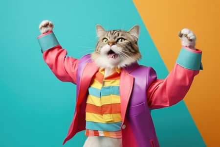 This lively and playful image features a stylish cat adorned in brightly colored clothes and sunglasses, dancing on a vivid green background. It captures a joyful, dynamic moment full of vibrant