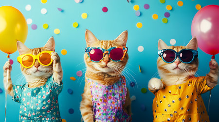 Celebrating cats with balloons fun party scene colorful background whimsical atmosphere playful viewpoint