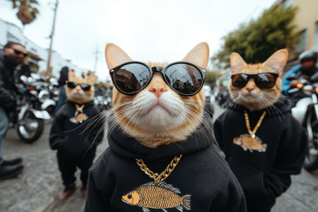 Three cats wearing sunglasses and hoodies are walking down the street