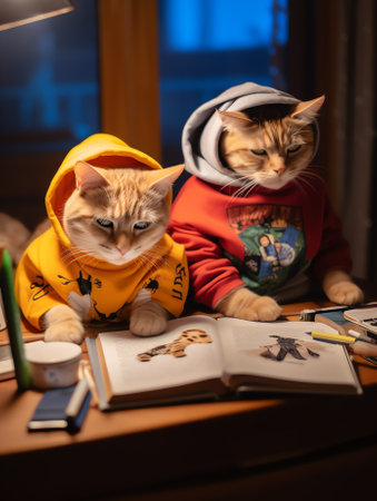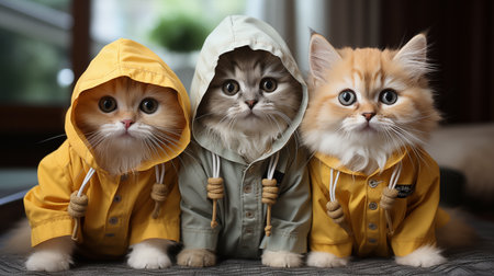Playful kittens in colorful hoodies cute scene indoor vibrant colors adorable pets
