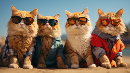 cats portrait with sunglasses, Funny animals in a group together looking at the camera, wearing clothes, having fun together, taking a selfie, An unusual moment full of fun and fashion consciousness