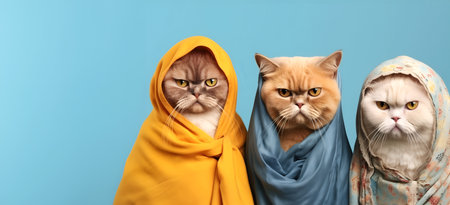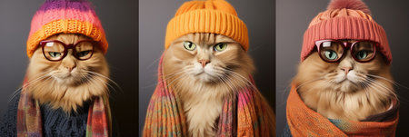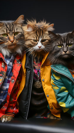 Domestic cats dressed in colorful jackets, children's winter jackets, stylish cats.