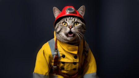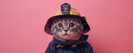 A cute cat in a firefighter's uniform on a pink background
