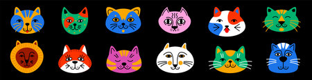 Cat characters. Trendy colorful abstract faces. Modern animal shapes, funny kid art, stray kitten in doodle artwork. Avatar portrait. Bright pets. Vector cartoon flat isolated illustration, tidy set