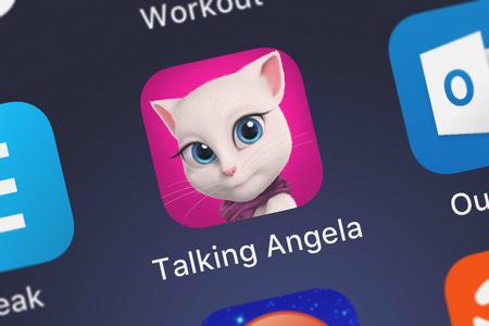 London, United Kingdom - October 03, 2018: Icon of the mobile app Talking Angela from Outfit7 Limited on an iPhone.