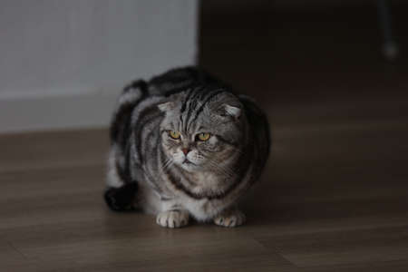 This image features a close-up of a Scottish Fold cat, characterized by its folded ears and expressive golden eyes. The cat's gray fur contrasts with the blurred background, suggesting an indoor setting. The composition focuses on the feline's face, highlighting its unique features. Suitable for various editorial and commercial applications.