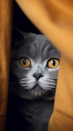 A detailed portrait showcases a grey Scottish Fold cat. The cat has folded ears and captivating yellow eyes. The image utilizes a clean, minimal style, with soft lighting enhancing the cat's fur. It can be used for various projects, including advertising or educational materials, showcasing animal themes.