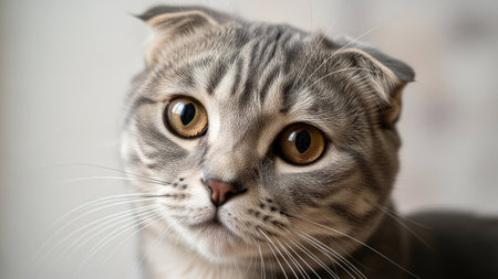 A close-up portrait showcases a Scottish Fold cat with folded ears and expressive eyes. The feline exhibits a gray and white striped coat, highlighting the fur's texture. The image features soft, diffused lighting and a neutral background, suitable for various editorial and commercial applications. The composition emphasizes the cat's face and creates a strong visual impact.