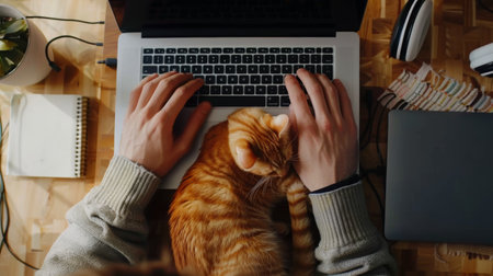 Close up of woman hands typing on laptop keyboard and cute ginger cat lying on the table