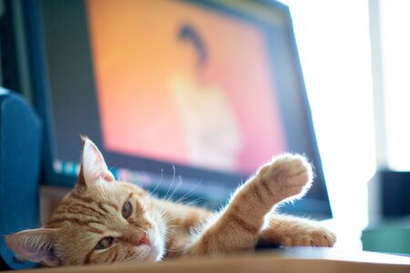 Beautiful young ginger cat well-fed and satisfied sleeps at home working place near monitor screen. Cute red kitten with classic marble pattern lies on table. Stay home, work home, quarantine