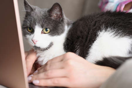 Domestic cat watch owner work on laptop, lay on lap with person