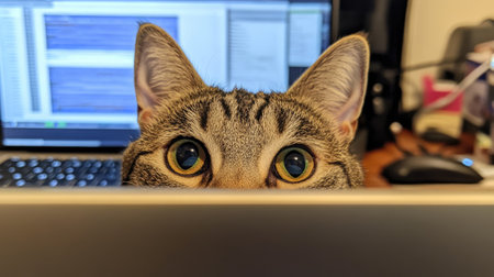 A curious cat peers over a laptop, captivated by the world of technology. This image captures a delightful moment in a cozy home office setting.