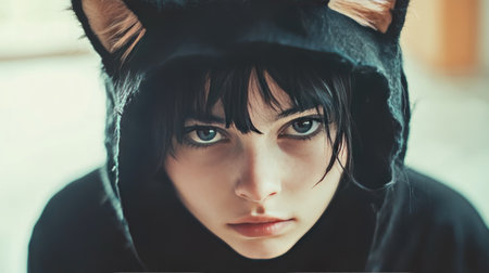 A person wearing a cat costume, wearing a cat wig.