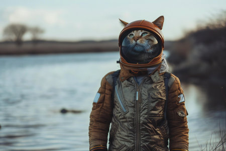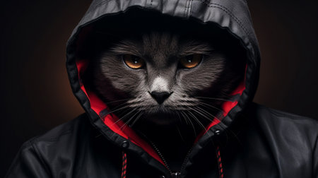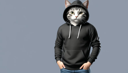 Anthropomorphic cat in hoodie standing confidently