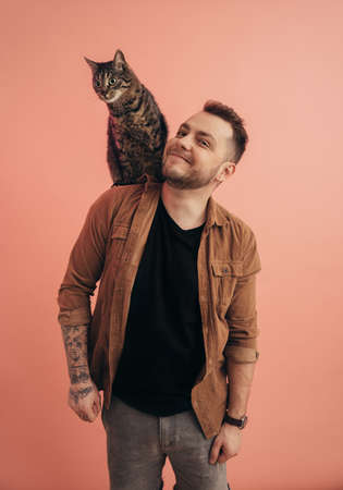 Bearded man smiling while his striped cat sitting at his shoulder